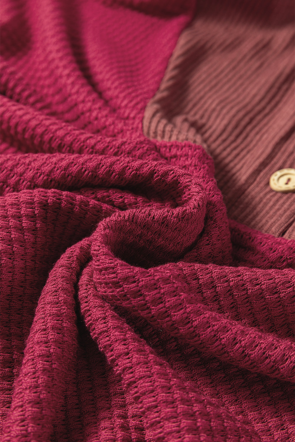 Racing Red Waffle Patchwork Drop Shoulder Hooded Long Sleeve Top